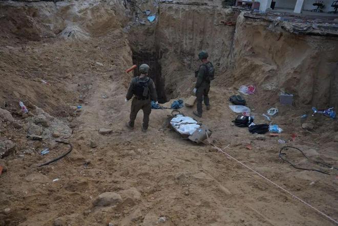 以色列国防军6月8日发布的照片显示,以军士兵在位于加沙地带南部汗尤尼斯的欧洲医院地下隧道外转移·辛瓦尔的遗体 图:新华社(以色列国防军供图)