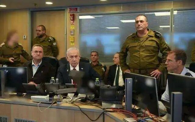 当地时间8月24日,以色列空军指挥中心,内塔尼亚胡等人观摩空袭行动 图:央视援引自以色列国防部长卡茨办公室